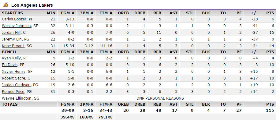 科比34投15中拿44分5籃板3助攻,希爾15分11籃板,布瑟6分5籃板,克拉克森10分,戴維斯8分5籃板,林書豪0分1助攻