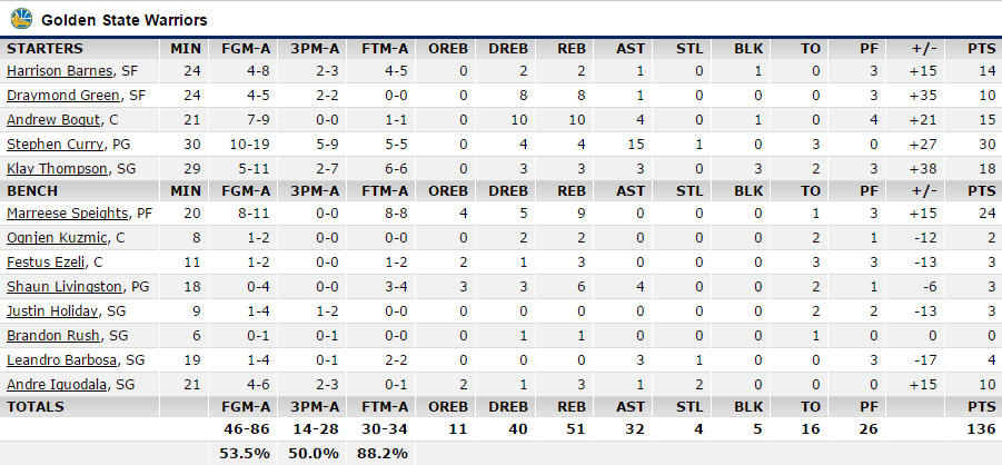 柯瑞30分15助攻,湯普森18分,伯格特15分10籃板,史貝茲24分9籃板,伊古達拉19分,格林10分8籃板,巴恩斯14分