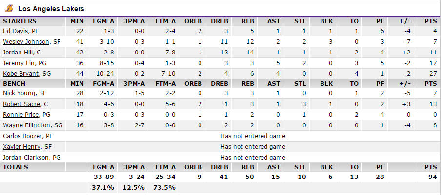 湖人這邊:科比得到了27分6籃板4次助攻,林書豪得到17分5次助攻、希爾得到11分14個籃板,強生7分12個籃板