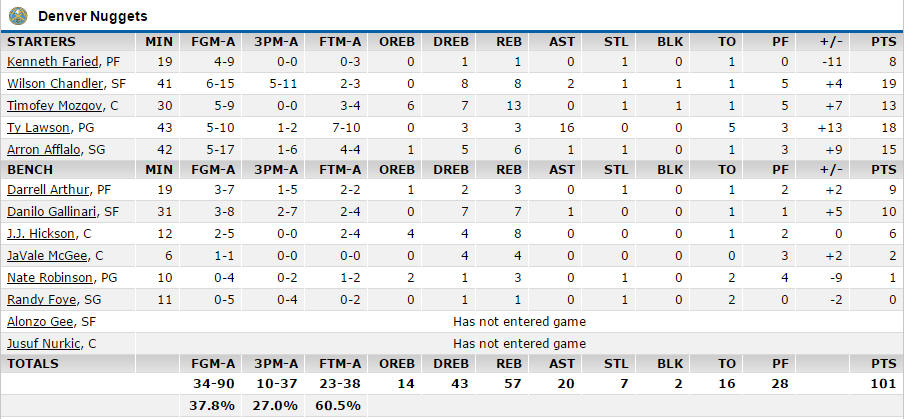 金塊這邊:勞森得到了18分16次助攻,阿法羅15分,莫茲高夫13分13個籃板、錢德勒19分8個籃板,加里納利10分7個籃板,法瑞德得到8分,亞瑟得到9分