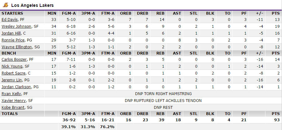 湖人這邊,全隊只搶了39個籃板,教練安排的板凳只能搶到8個,先發板凳幾乎都是差不多時間五上五下,讓這場比賽明顯讓板凳歸板凳而先發歸先發,不給板凳有很充份的火力支援。