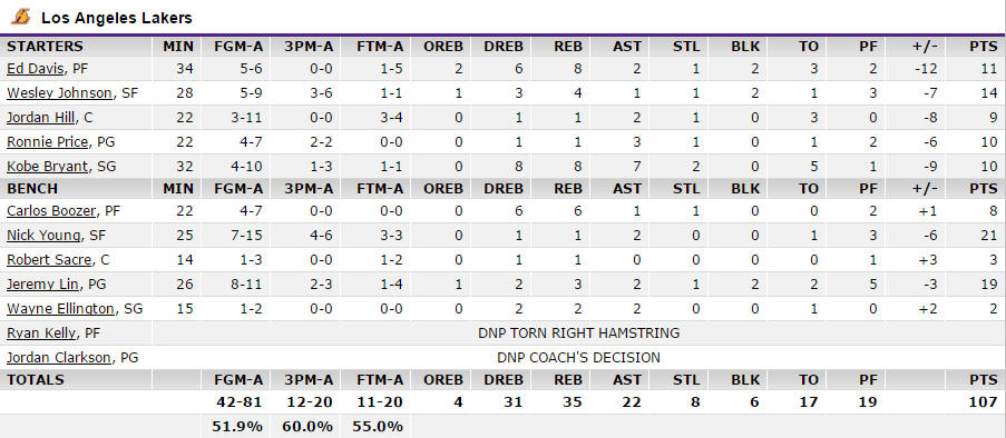 看數據, 湖人長短炮得分率皆勝太陽, 是輸在失誤太多及末段接連犯規失分? 怎麼近期 Hill 都沒了季初接連兩雙的好表現? 今天更只得一籃板! 請教版大。