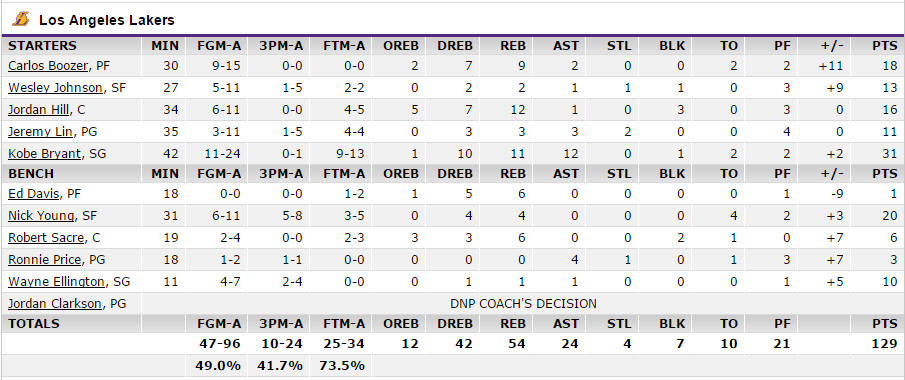 湖人數據:林書豪11分3助攻,科比31分11籃板12助攻(大三元),希爾16分12籃板,強生13分2籃板,布瑟18分9籃板。