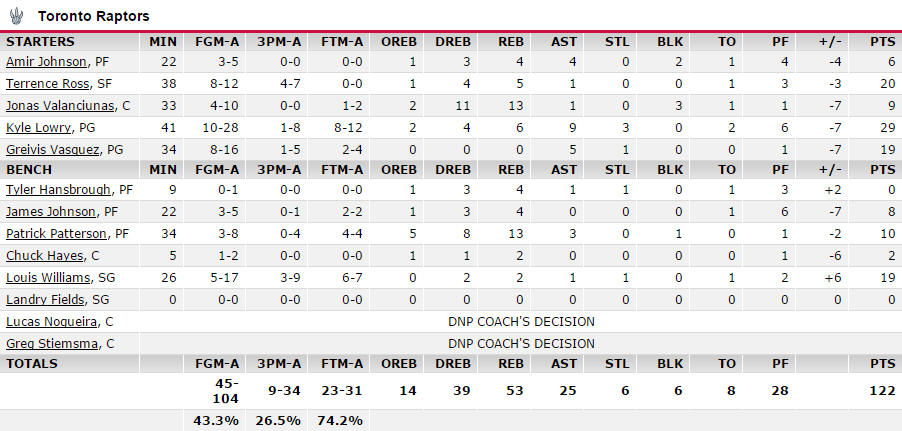 暴龍數據:洛瑞29分9助攻6籃板,強生6分4籃板,威廉斯19分2籃板,瓦斯奎茲19分5助攻,羅斯20分5籃板。