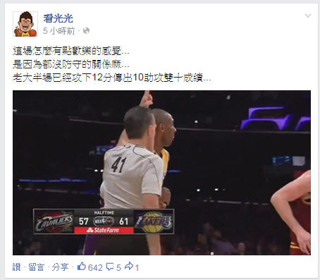 我是不知道有沒有人和我一樣的感覺,上半場雙方都不設防,感覺很像在打明星賽一樣,觀眾看節目,通常喜歡看到華麗的進攻表現,而不喜歡死氣沈沈的比賽,所以,上半場雙方都儘量讓對手出手沒那麼難受,湖人半場就出現少見的61分及接近60%(59.5%)的命中率。