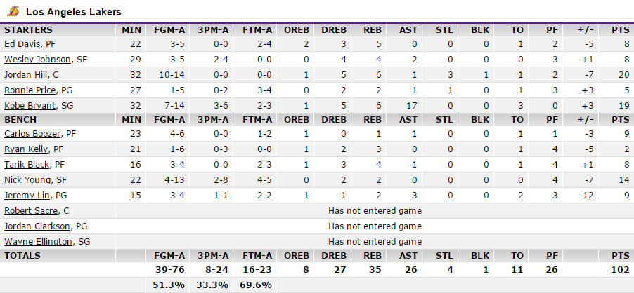 幸好書豪還算爭氣,上場時間最少,尤其是第四節,最後攻下兩分還是因為隊友沒人可傳,才傳書豪攻下的,15分鐘拿9分,得分是全隊第四高(希爾20分、科比19分、0號楊14分、布瑟和林都是9分。)
