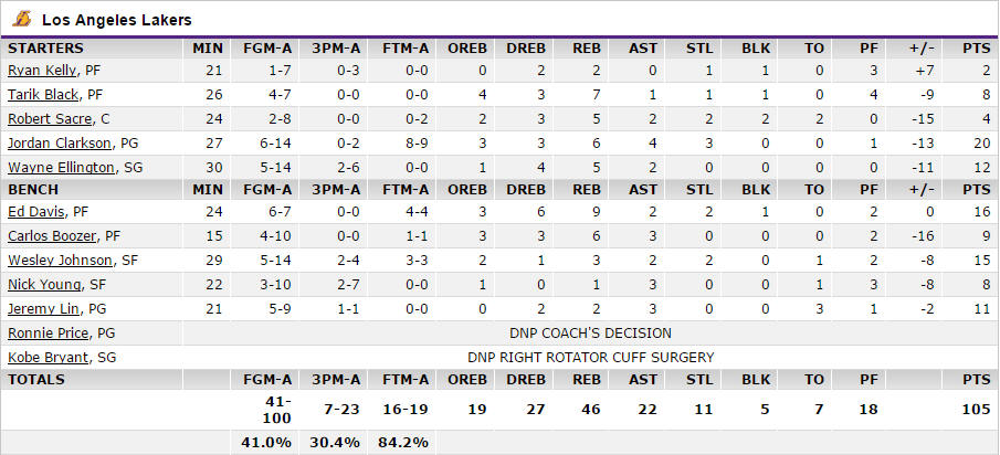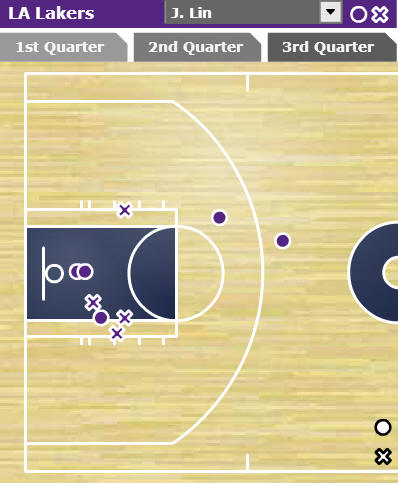 比分被拉開很明顯是從林書豪第二節下來後,整個湖人兵敗如山倒,僅剩6:03秒從41比44到變成49比64。被打了20比7的誇張比數。其中「愛神」洛夫連續四記三分命中,讓湖人傷害最大。