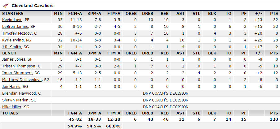 當「詹姆士」被嚴守時,他仍會把球權交給厄文,因此,厄文也攻下28分10助攻雙十的表現,尤其是第四節大幅領先時,騎士教練還讓厄文多刷了些數據再下來,了解球員的心理,也難怪騎士戰績愈來愈好。