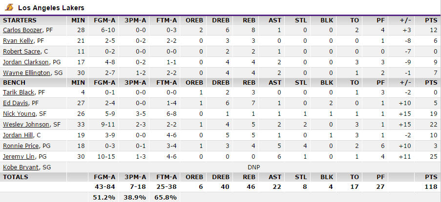 教練不僅變陣,但手法都變來變去的,說實在的我還是不清楚今天是否有想讓林書豪DNP的意圖,主要是因為看比賽期間的廣告一直主打林書豪要上「湖人之聲」(Laker Voices)的節目及林書豪拜年的廣告,感覺都像是用他來維持住基本盤招覽生意。