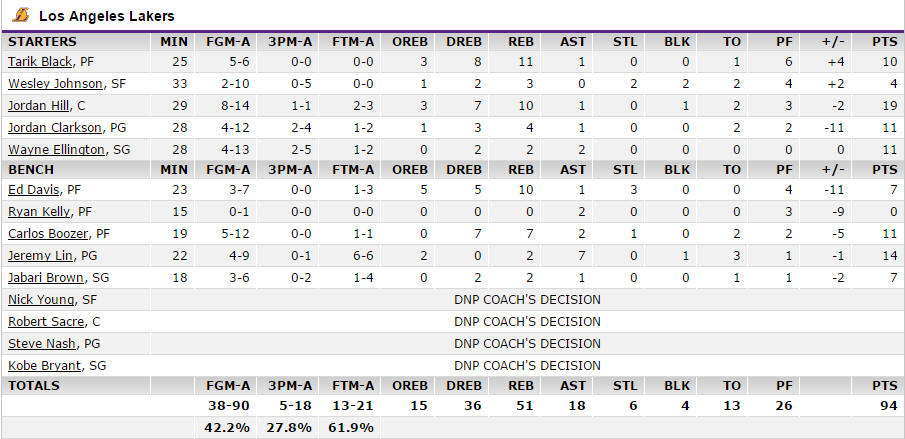 這一戰第四節關鍵換下林書豪就是想讓湖人輸的徹底。第四節從林書豪剩7:07秒下來時,一直到比賽結束,居然只有出現1次助攻,而那次助攻,克拉克森是受助的人。先發五人共計只有5助攻,而林書豪一人就7助攻,是兩隊最高助攻球員了。