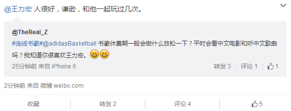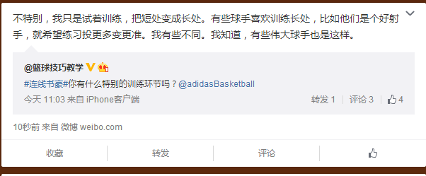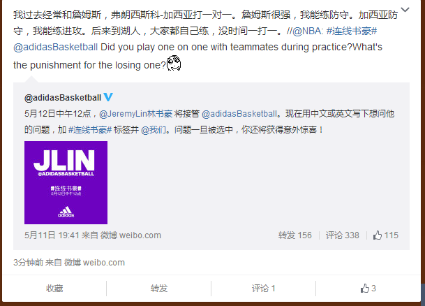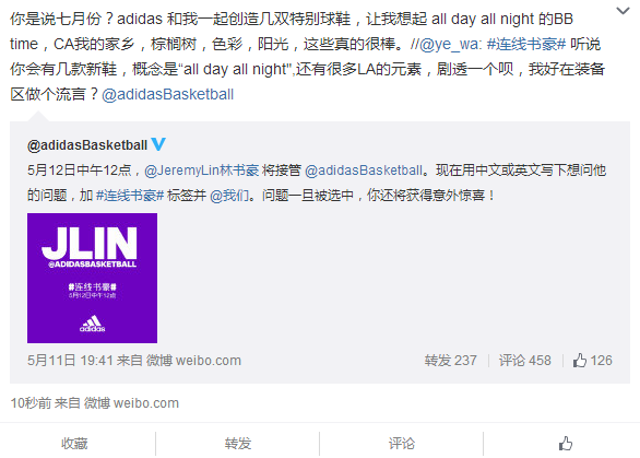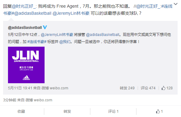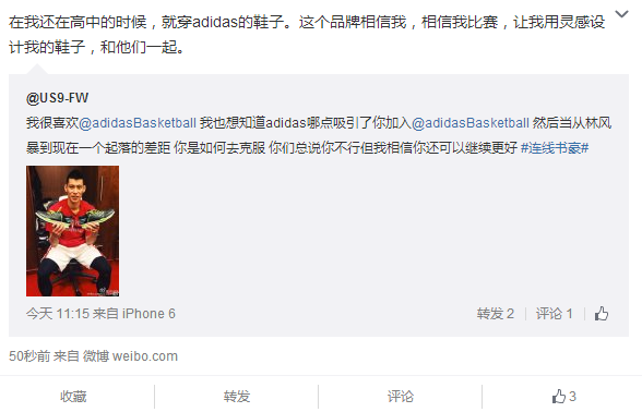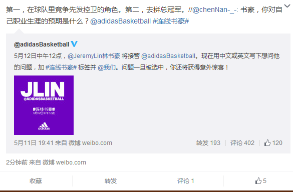 ifang23同意分享他們整理的【2015.05.12 《連線書豪》 adidasBasketball 微博問答】的這篇文章來分享,感謝【 JF翻译组】的辛苦整理。