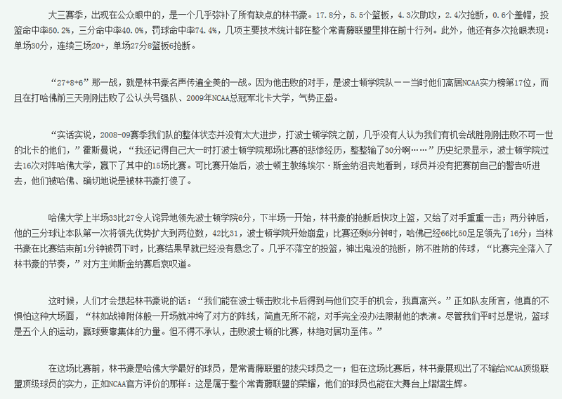自己可以在NCAA打得很好?下面是林的某本傳記所記錄的那一戰,原來是這場比賽讓大學時期的林出名