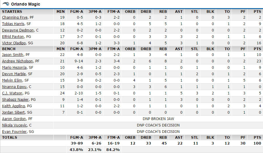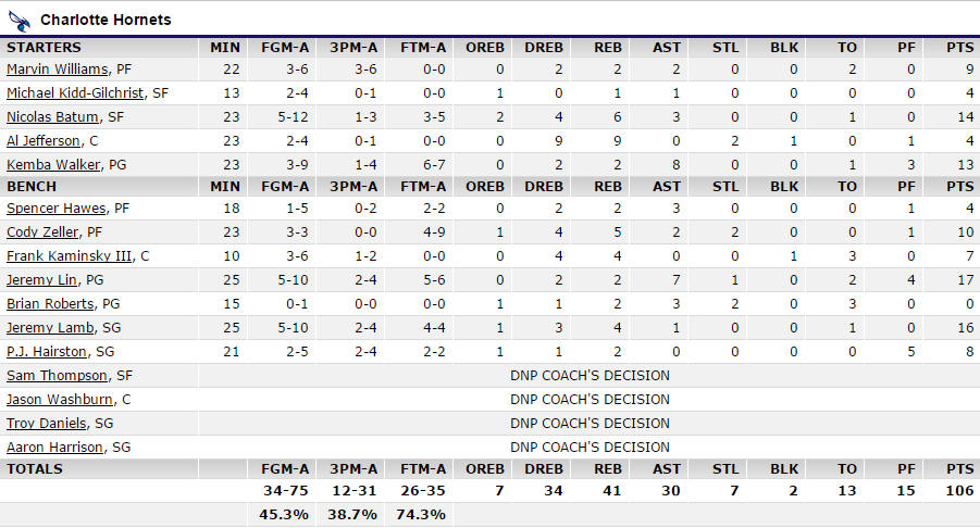 雖然黃蜂開出紅盤,此場比賽以106:100勝出,但對手先發上場時間不長,第四節關鍵時,刻兩邊也都沒替換上先發陣容,可以說練兵的意味濃厚,但面對魔術這種等級的球隊,黃蜂上半場還多半處於落後狀態,這表是黃蜂的陣容和磨合程度,還沒調整到最佳,也可以說教練還沒找到最佳陣容與戰術。