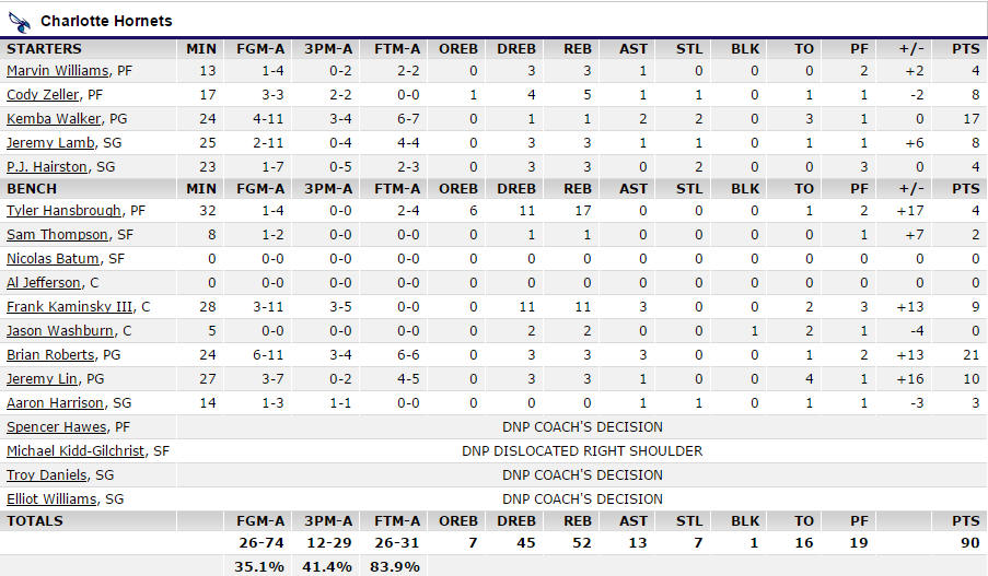 【進攻上】全隊出手最多的球員都是11次,分別是沃克、羅勃絲、藍伯及卡明斯基,而得分上雙只有三位,分別是替補控衛羅勃絲(Brian Roberts)的21分,先發控衛沃克(Kemba Walker)的17分,及林書豪的10分(出手7次),在幾乎不是他控球的情況下,能把握有效的得分方式,以團隊為上才是展現價值的最好方式。