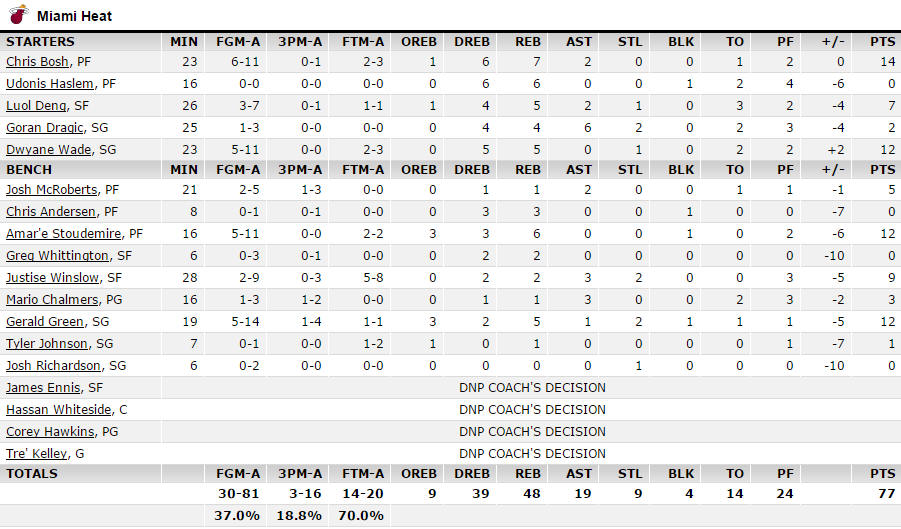 林書豪兩次都是在僅領先1分的情況下上來替補,而兩次都能完成使命的拉開比分,終場大勝熱火13分,然而林書豪的+/-值是+16,全隊僅次於泰勒.漢斯伯格(Tyler Hansbrough)的+17,就足以說明他的價值了。