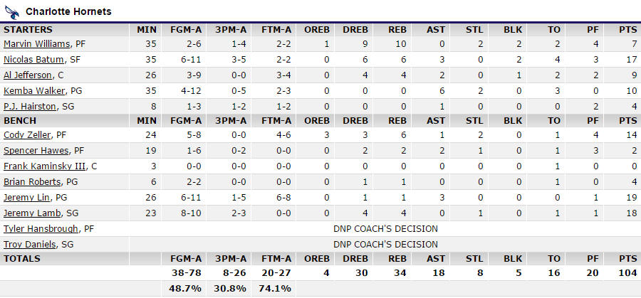 林書豪在這時候(3:57秒)跳出來再命中一記中距離,適時的穩住黃蜂的陣腳,在林書豪狀況佳的時候,灰狼就派重兵嚴守林書豪,這時沃克被鬆守後,當然接著得分,巴頓又再得分,整個黃蜂氣勢才得以保存,最終贏球。