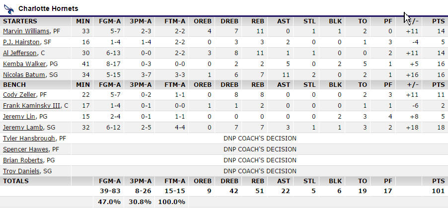 只是,最後巫師自己不爭氣,一路狂洩,林書豪(4犯)下來時還有5分07秒巫師是85分,終場是87,巫師後來的2分,還是剩23秒時才靠罰球拿到的,領先這麼多,再把林書豪換上去的意義也不大了,也不想破壞這效應,克總如果這時候把林書豪換上來,會讓人覺得挺林書豪太明顯,一般教練也不會這樣做的,就不需要多此一舉,我覺得從這個角度來解釋,就不會覺得克總的調度很怪了。(整個第四節巫師只攻6分,黃蜂打了27分。)
