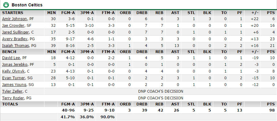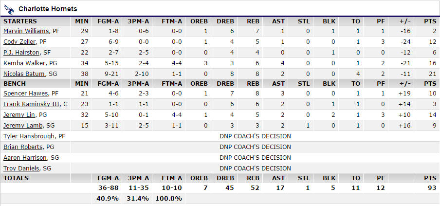 最後,黃蜂先發全部負雙位數,BF1全部正雙位數,塞爾迪克隊助攻26(湯瑪士一個人就13個),黃蜂助攻只有17(第二隊還比先發多),少見的黃蜂籃板搶贏對手10顆(52:42),最後還贏不了球。