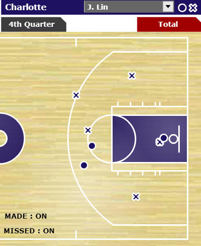 第三節先發的狀況更嚴重,領先4分花光不說,也沒凍結分差,反倒還一度輸超過10分,在林書豪上來時是落後9分(57比64)了,但沃克當時還在,而且也是主控,一直到沃克下來時,黃蜂整個已經落後12分(59比71)。