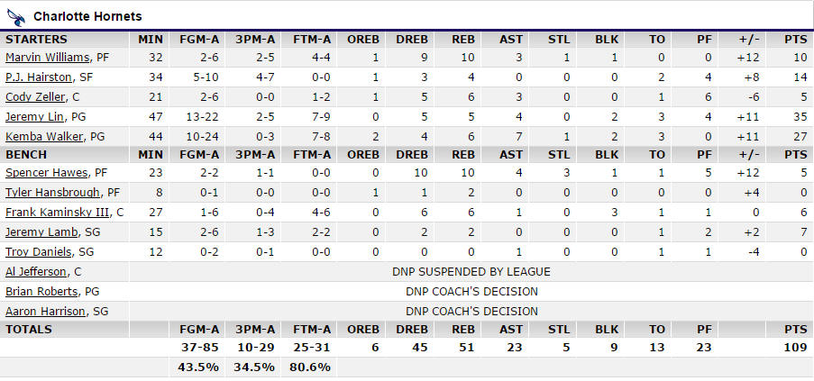 今天解除封印的林再加上先發,果然打出代表作,不要含OT打了47分有點多,球季82場要小心使用啊!至於巴圖是否真的流感未上,就不得而知了,如果能在季後優先與林續長約以林為球隊基石建構黃蜂隊的團隊籃球最好的想法,球隊明顯需要一名阻攻與擋拆的中鋒大個,拿AJ去換也是很好的,再者讓巴圖在這季打出身價,明年黃蜂要續約是很困難的,因為轉播權利金調漲,許多球員都等明年換大約,所以就算黃蜂拿巴圖去交易也沒什麼覺得意外,唯一不會被交易的是林,有人說或許林去76人跟安東尼會比較好,個人覺得以安東尼的純跑轟戰術,跟克福德的更多樣系統戰術來說,球員的使用上,健康上留在克總這裡絕對比去76人好,如果我是喬丹的話,跟書豪簽十年約(誇張嗎?一點也不會)前七年為球員約後三年為球員與球隊助理教練約,雖然夏洛特是小市場球隊,但是帶出口碑與戰績,全NBA市場哪裡沒有需求呢?