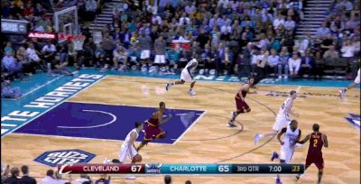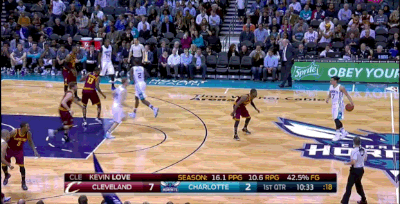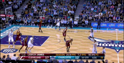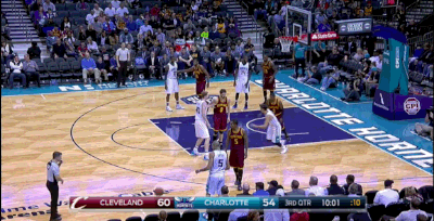 這里澤勒設了掩護讓林獲得空位,然後在內切到籃下前,很快再設一個掩護。林沒有直接突破到籃下,而是做出要這麼做的威脅。樂福已經結結實實的擋在林的路徑上,但隨著特里斯坦-湯普森和詹姆斯前來包圍油漆區時,空位投籃機會還是出現了。當詹姆斯過度防守時,出現了空間讓球飛越到對面角落的馬文那裡。再一次,對林的關注吸引了防守者前來。