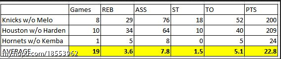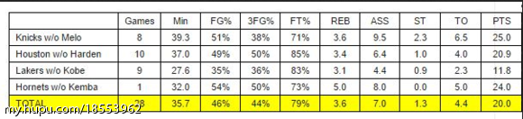 不管怎樣,只是覺得我應該指出Tom計算中的潛在錯誤,我不想給這裡的讀者一些有潛在錯誤數據的文章。不過這個不重要。我想做得就是計算林的平均值,不包括湖人那9場的平均值。這裡是林的那些19場首發,超過30分鐘,沒有甜瓜,哈登和沃克的比賽數據:
