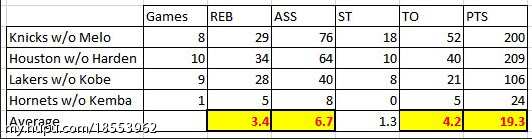 不僅僅放上來平均值,我先把總數放進來,然後計算平均值,所以你能看出來我是怎麼算的。你能看到,林平均22.8分,7.8個助攻,3.6個籃板,5.1個失誤和1.5個搶斷。而最讓人驚訝的就是這些比賽是14勝5負!這可是74%的勝率!這就是為什麼很多林密不停地對聾子說的:“沒有林,不會贏”。 如果球隊關心贏球,他們就會讓林作為進攻的關鍵人,就像是德安東尼那樣,然後他們會得到很帥的回報。林一隻手把非常平庸的尼克斯隊(可能是一隻樂透球隊)帶到季後賽。