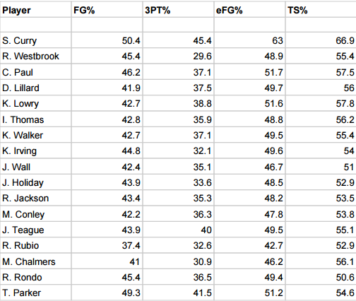 上賽季以PER值為基準的領銜控衛們的投籃命中率: