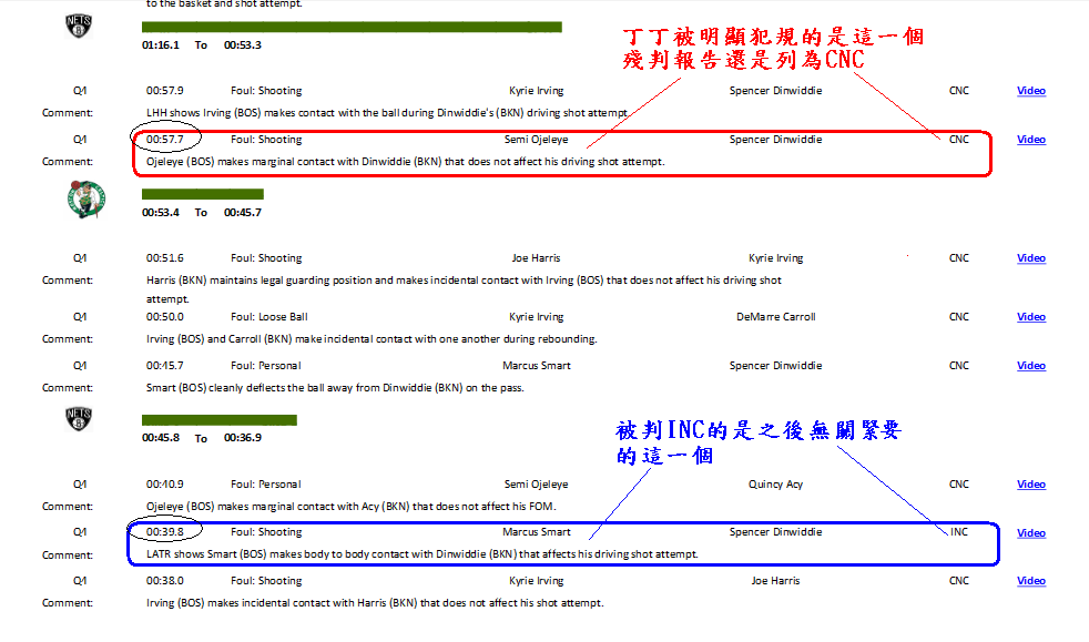 在之前分享的動圖裡面丁丁被明顯犯規是被塞隊#37的 Semi Ojeleye (在殘判報告 00:57.7的那一項,被判為CNC)犯的,而報告裡面列為INC的則是再後面的一個丁丁上籃被塞隊#36 Marcus Smart的犯規(在殘判報告 00:39.8 的那一項),問題是被判INC的這個根本無關緊要,因為那一球碰到籃框又被小哈給補進了,而真正在之前被嚴重犯規的那一個讓塞隊5打4拿了三分才是關鍵,更可笑的是被判CNC的理由是說:“ Ojeleye (BOS) makes MARGINAL contact with Dinwiddie (BKN) that does not affect his driving shot attempt. ”(塞隊的Ojeleye 只有和丁丁身體些微接觸並不會影響到他上籃的動作)100%澈澈底底睜著眼睛說瞎話的大謊話,國外網友說的沒錯:這場比賽的NBA殘判就是眼瞎了,NBA官方就是恬不知恥!