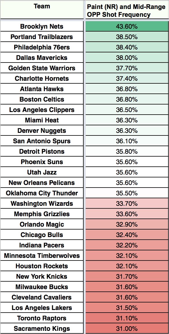 今天看到一則統計數字:籃網居然在“限制對手投籃出手在禁區以外及中距離的比例”的這項數據是排名第一的43.6%,而且是大幅領先排第二38.5%的拓荒者隊,原來籃網的內線沒有我們感覺的那樣差,要是有了像DMo這樣的先發等級的 stretch 4加入加上不斷進步的阿倫,籃網戰力的升級恐怕不是只有一個檔次而已
