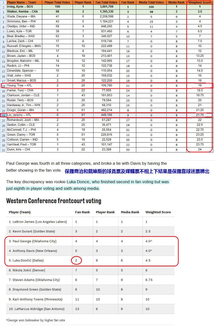 全明星票選的最後結果是看表格最後那一欄的加權分數的排名,從小羊的球迷票選排名(21)和得票數(只有林的1/4不到)看都是大幅落後林的(球迷票選排名9),雖然他的媒體票也是掛蛋,但是他只拿了兩張球員票,就讓他的總分大幅躍進到第十八名排在林的第二十四名前面,林的前湖人隊友克拉克森也是一樣只憑一張球員票就竄到林的總排名前面,由此可見最關鍵的是球員票,只有當球員票和媒體票很接近或相同的時候,球迷票才是拿來作為tie breaker用:例如西區前場的保羅喬治和戴維斯。另外還有一個例子就是唐七七:他的球迷票選排在西區前場第二名只落在LBJ之後,可是球員票和媒體票排名分別只是8和6,所以最後加權後的總排名只有第五和全明星失之交臂,他如果能多得一些球員票的話,不但能進全明星而且很有可能還是西區先發: