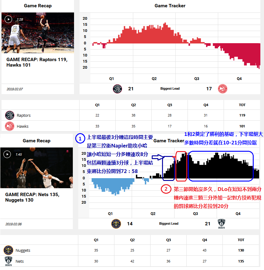 1. 今天這場比賽暴龍還讓了兩個主將,前一天的籃網vs金塊是全員到齊:金塊一軍的主將雙塔+兩個後衛都打了三十幾分鐘,結果也是非常的兩極化–今天老鷹把最多領先的17分快速敗光,而前一天的籃網在第一節最多落後14分的情況下又快速追平,更在第二節結束前超前達14分之多,下半場開始DLo手風又出奇的順連進三個三分球將比分差最多拉大到21分,之後籃網全隊將士用命就一直將分差限制在10-21分之間,金塊雖然在最後2-3分鐘想拼命扭轉,但是籃網也一直都有人跳出來在攻防兩端有貢獻將領先的優勢牢牢鎖住