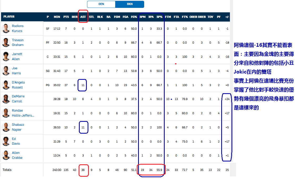 3. 前一天的籃網vs金塊的比賽是非常經典的阿金最愛的動態進攻/傳導(籃網全隊有36個助攻,兩個PG就各包辦了11個)再加上三分雨:全隊三分19/34命中率55.9%,DLo一人包辦了6/9 66.9%